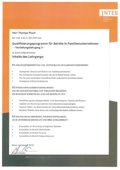 - Strategy review and strategy development in family businesses: strategic opportunities and risks, key strategic concepts, systematic assessment of business models, strategic early warning indicators